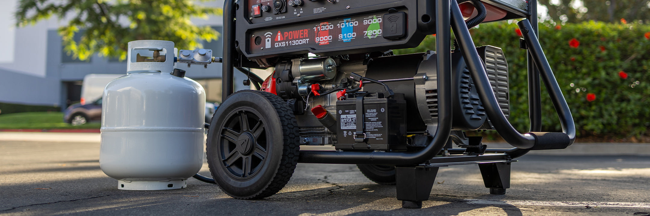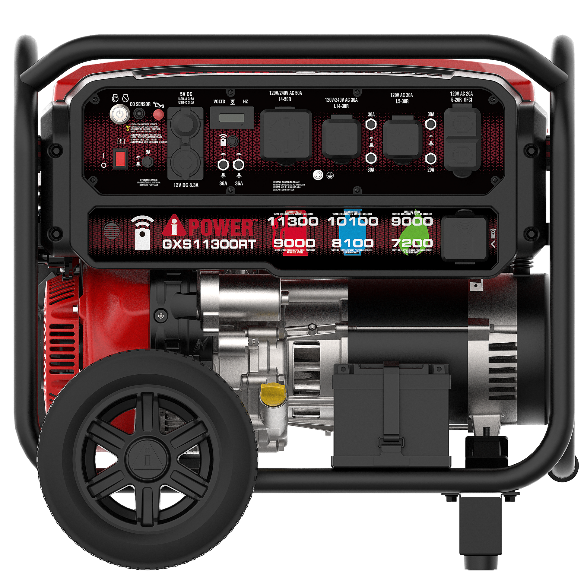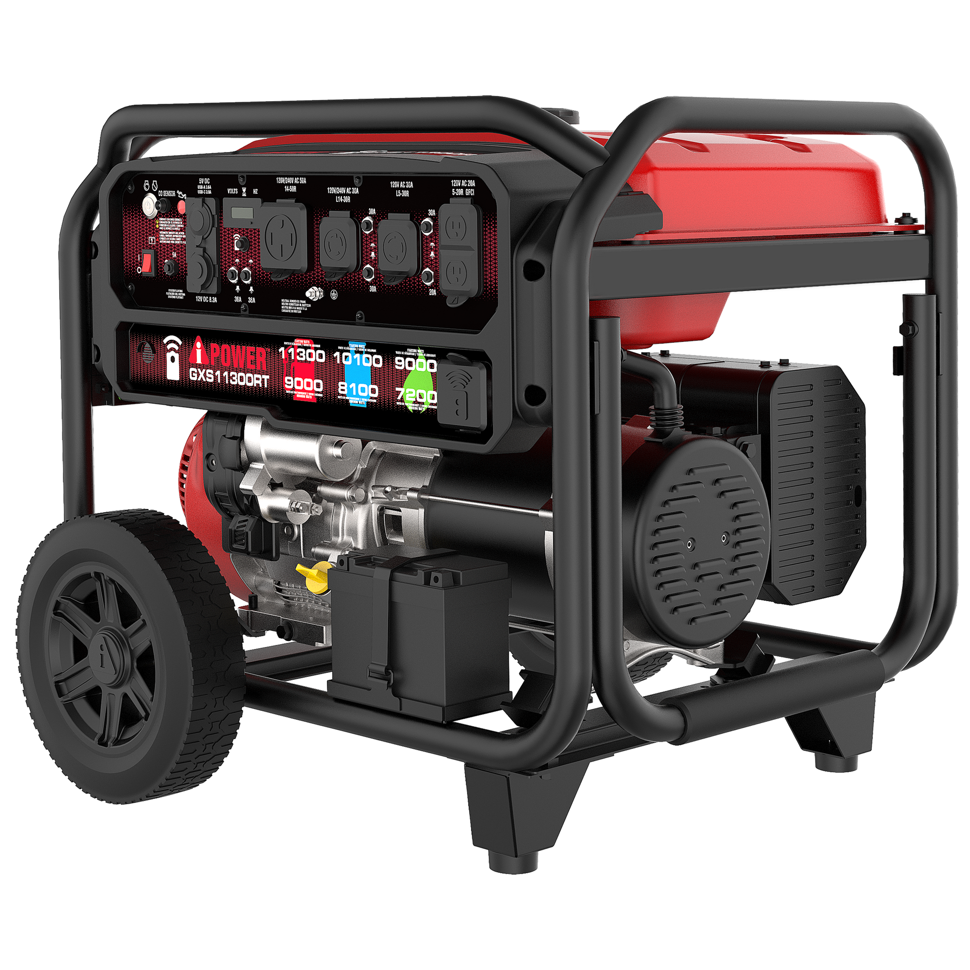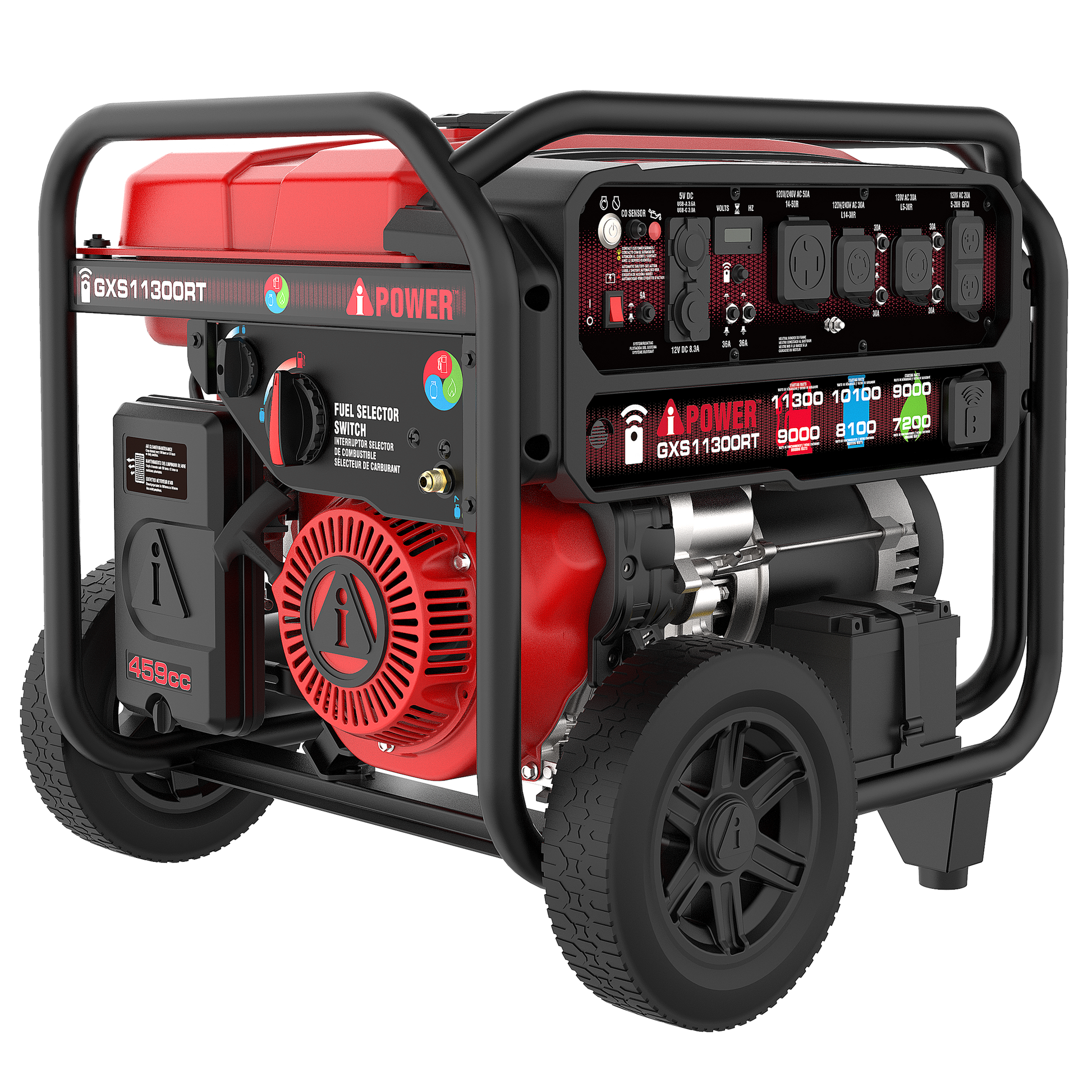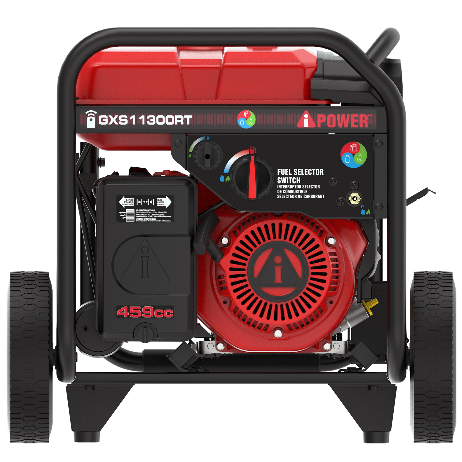 Featuring a 459cc OHV engine with cast iron sleeve and low oil shutdown, the GXS11300RT Remote Tri-Power Portable Generator has 11,300 starting watts and 9,000 running watts on gasoline, 10,100 starting watts and 8,100 running watts on propane, and 9,000 starting watts and 7,200 running watts on NG. It offers simple starting through recoil, electric, and remote start, plus a battery and fob is included.