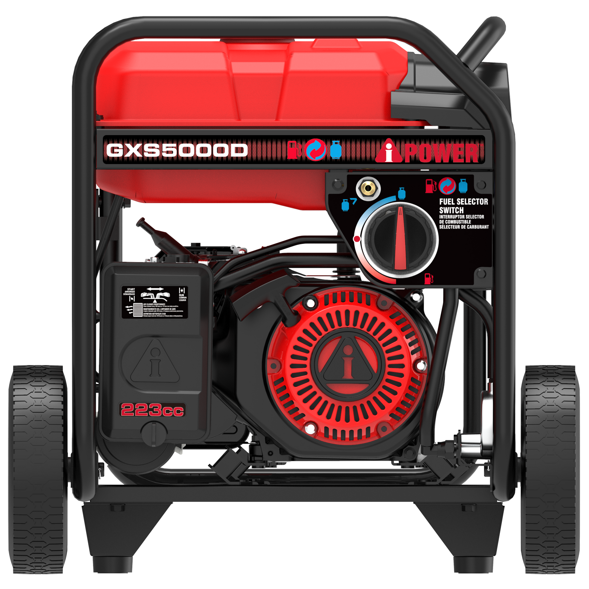 | Featuring a 223cc OHV engine with cast iron sleeve and low oil shutdown, the GXS5000D Dual Fuel Portable Generator has 5,000 starting watts and 4,000 running watts on gasoline and 4,500 starting watts and 3,600 running watts on propane. The dual fuel option offers flexibility while out on the road or during an emergency. The 6.3-gallon fuel tank provides an extended run time of up to 20 hours at 25% load. The unit has a Digital Data Center that displays voltage, frequency, and hours, while the Rubber Outlet Covers help guard against moisture, dust, and debris. The heavy-duty frame construction has a durable automotive style finish, while the portable design makes the generator easy to transport, as there is a folding handle and wheels included. The CO Sensor monitors and reacts to carbon monoxide levels, as it has automatic shutdown. | Regular price