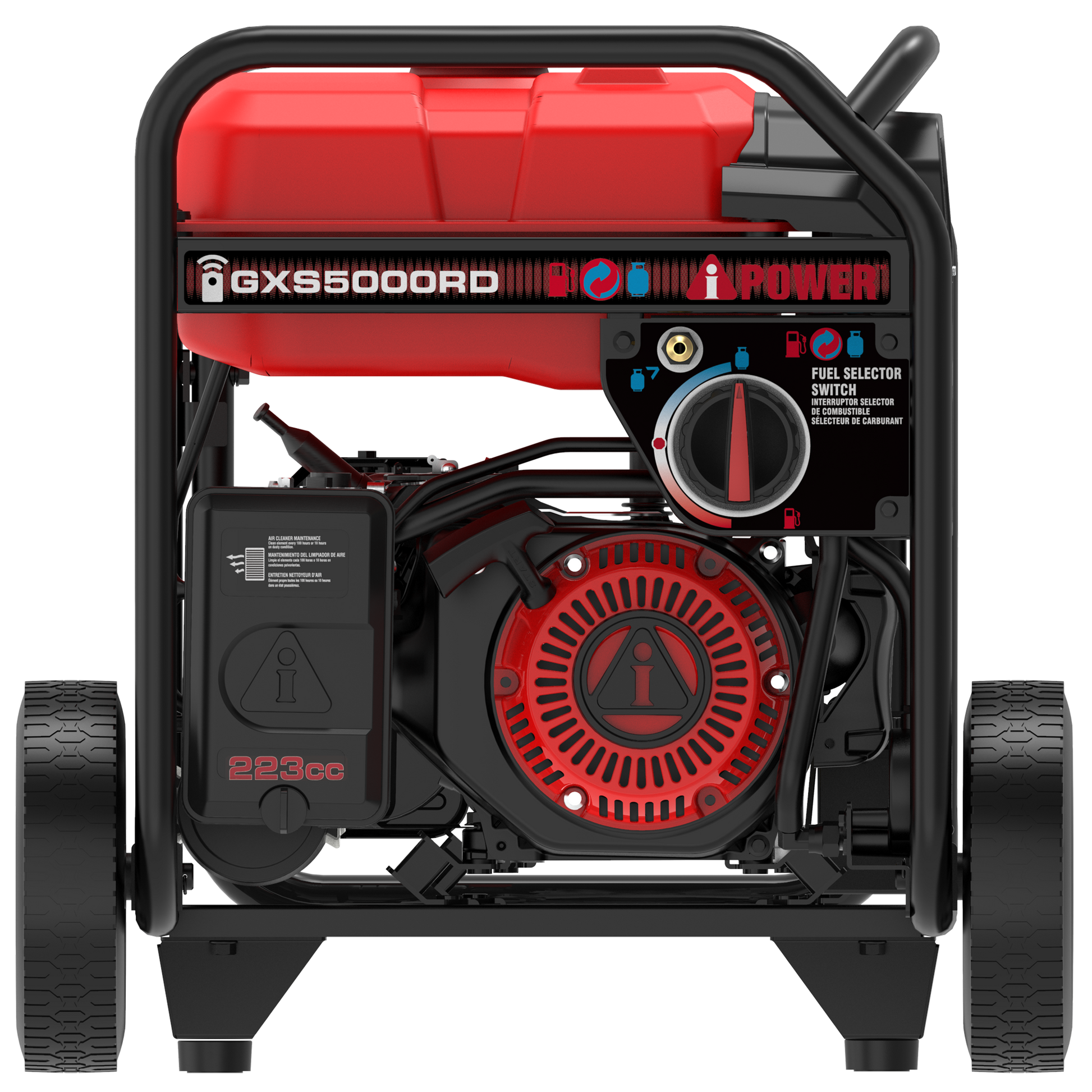 | Featuring a 223cc OHV engine with cast iron sleeve and low oil shutdown, the GXS5000RD Remote Dual Fuel Portable Generator has 5,000 starting watts and 4,000 running watts on gasoline and 4,500 starting watts and 3,600 running watts on propane. It offers simple starting through recoil, electric, and remote start, plus a battery and fob is included. The dual fuel option offers flexibility while out on the road or during an emergency. The 6.3-gallon fuel tank provides an extended run time of up to 20 hours at 25% load. The unit has a Digital Data Center that displays voltage, frequency, and hours, while the Rubber Outlet Covers help guard against moisture, dust, and debris. The heavy-duty frame construction has a durable automotive style finish, while the portable design makes the generator easy to transport, as there is a folding handle and wheels included. The CO Sensor monitors and reacts to carbon monoxide levels, as it has automatic shutdown. | Regular price