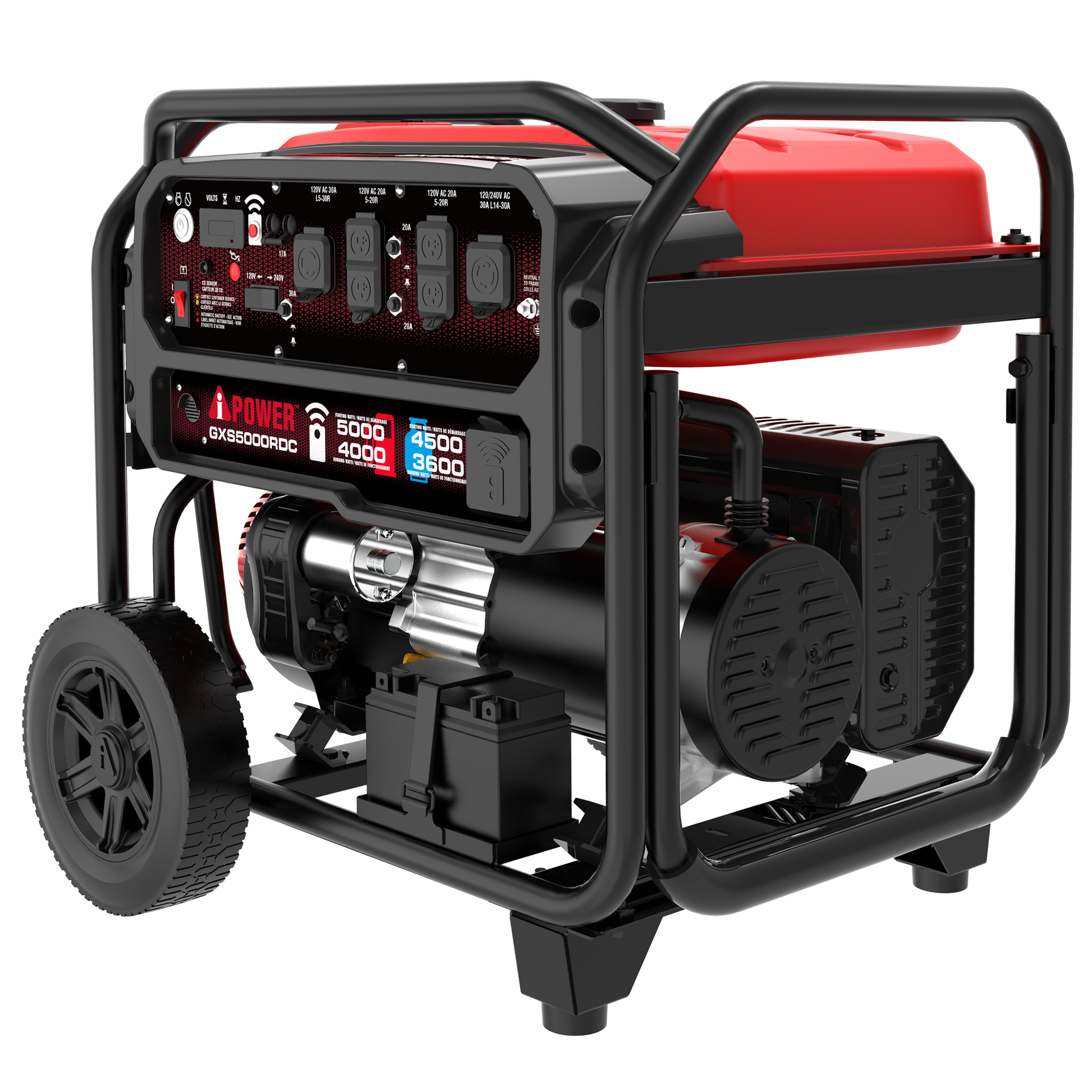 Featuring a performance series 223cc OHV engine with a cast iron sleeve and low oil shutdown, the A-iPower GXS5000RDC Remote Dual Fuel Generator has 5,000 starting watts and 4,000 running watts on gasoline, with 4,500 starting watts and 3,600 running watts on propane. Built tough with a durable automotive-style finish, the 6.3-gallon fuel tank provides an extended run time of up to 20 hours at a 25% load.