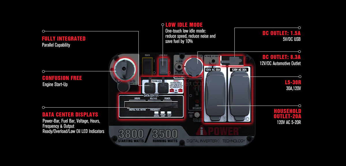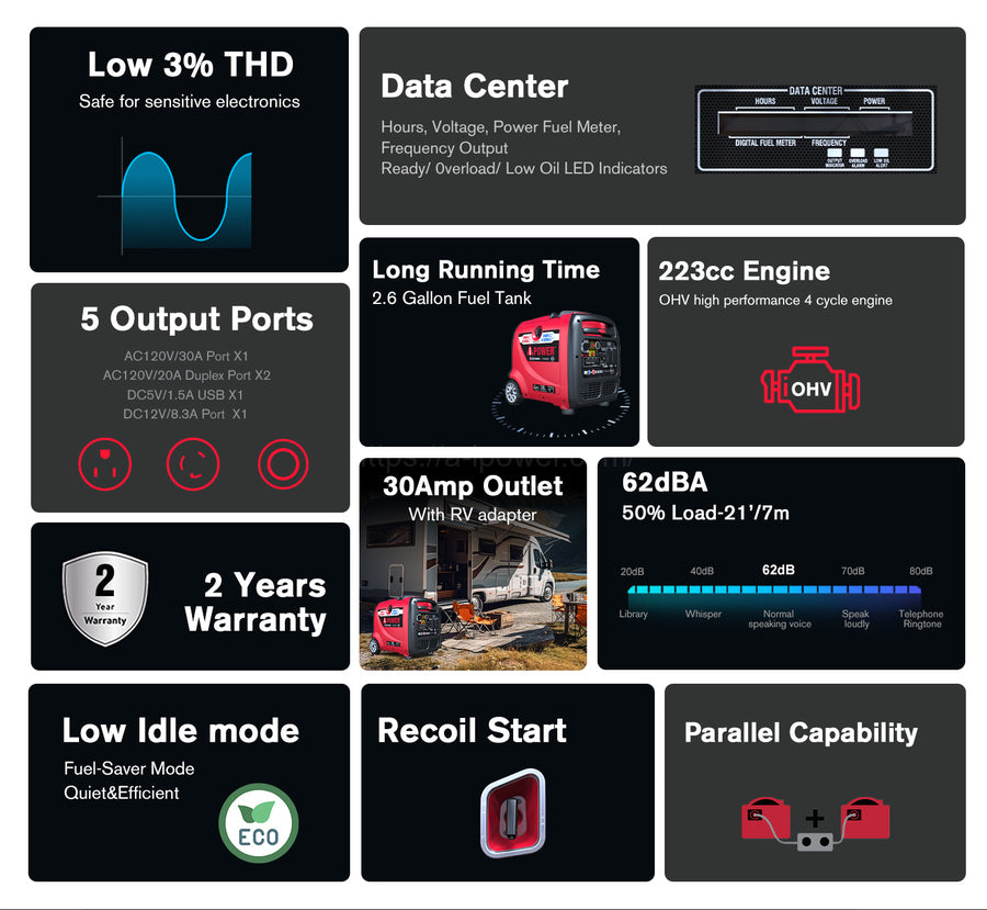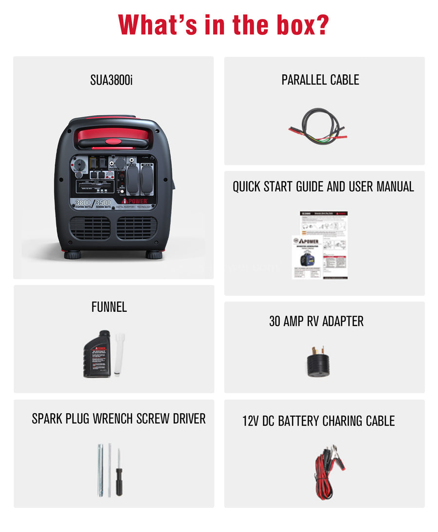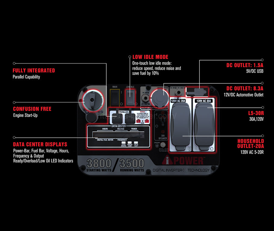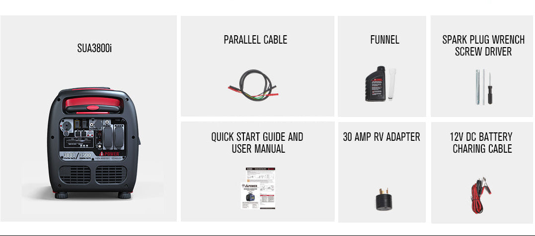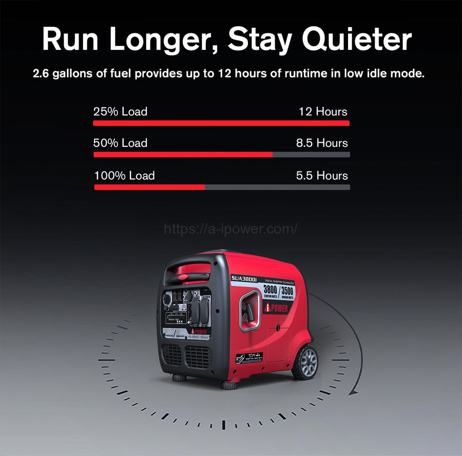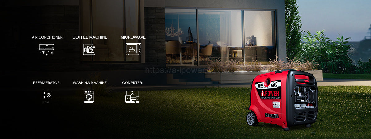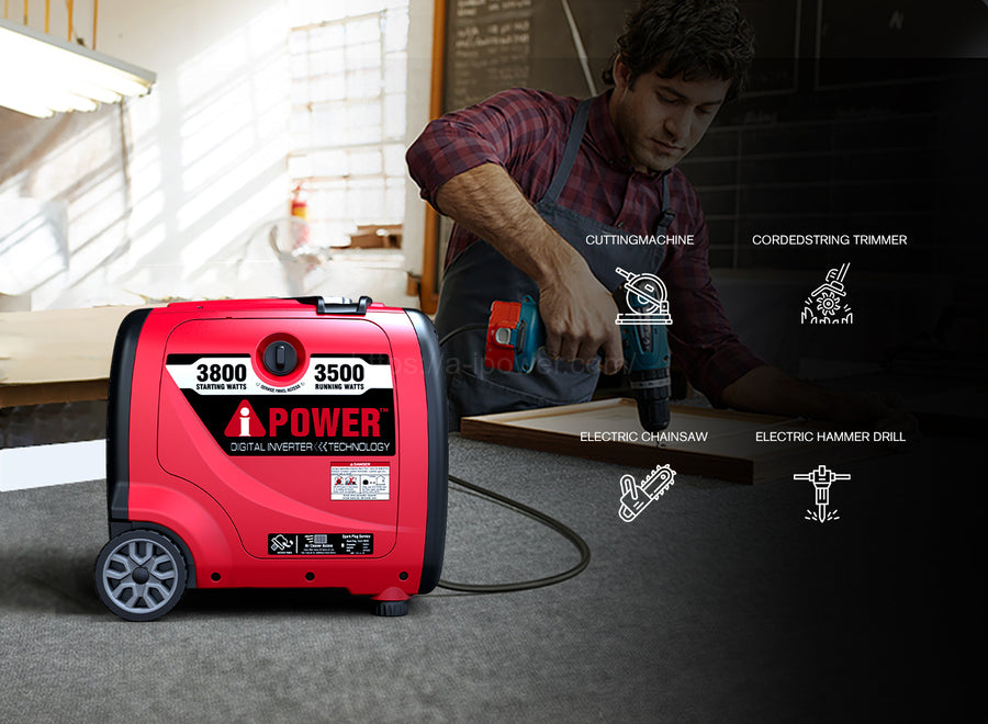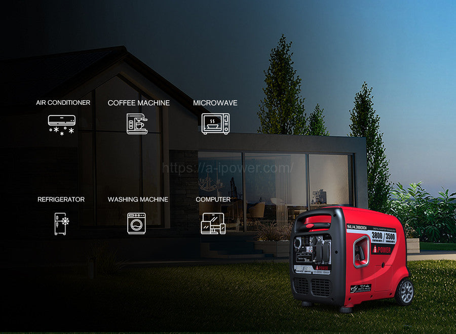 | The A-iPower SUA3800i is a powerful and quiet portable inverter generator designed for home backup, RV travel, outdoor events, and recreational use. Delivering 3500 running watts and 3800 starting watts, it provides reliable 120V power while producing clean, stable electricity that is safe for sensitive electronics. Powered by a 223cc Senci OHV 4-stroke gasoline engine, the SUA3800i runs efficiently for up to 12 hours on a single tank and operates at a low noise level of just 63 dB, making it suitable for campsites, tailgates, and neighborhood use. Its pure sine wave output with less than 3% THD ensures smooth and consistent power for modern devices. The generator features multiple power outlets, including two 120V 20A AC outlets, a 120V 30A locking outlet, a USB port, and a 12V DC outlet, offering versatile connectivity for household essentials, tools, and electronics. It is also parallel-ready, allowing you to connect a second compatible unit for increased power when needed. Designed with portability in mind, the SUA3800i uses an enclosed inverter housing to reduce noise and enhance durability. Built-in wheels and a telescoping handle make it easy to move despite its robust construction. A digital control panel provides real-time monitoring of fuel level, power output, voltage, and run time, while integrated safety features such as overload protection and low-oil shutdown deliver added peace of mind. | Regular price