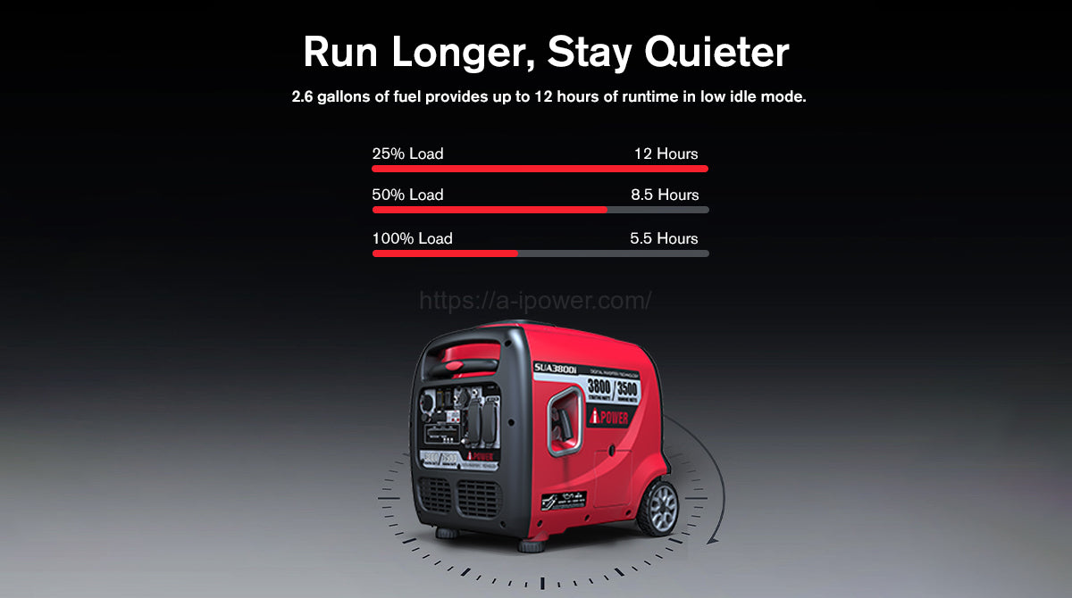 - Low Idle Technology: Extended run time of 12 hrs. at 25% load