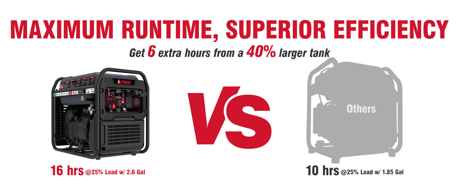 - 2.6 Gallon Tank, up to 16.0 Hour Runtime @ 25% Load or 8 Hours @ 50% Load