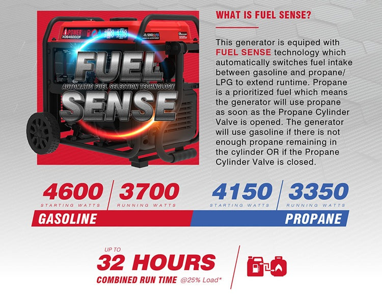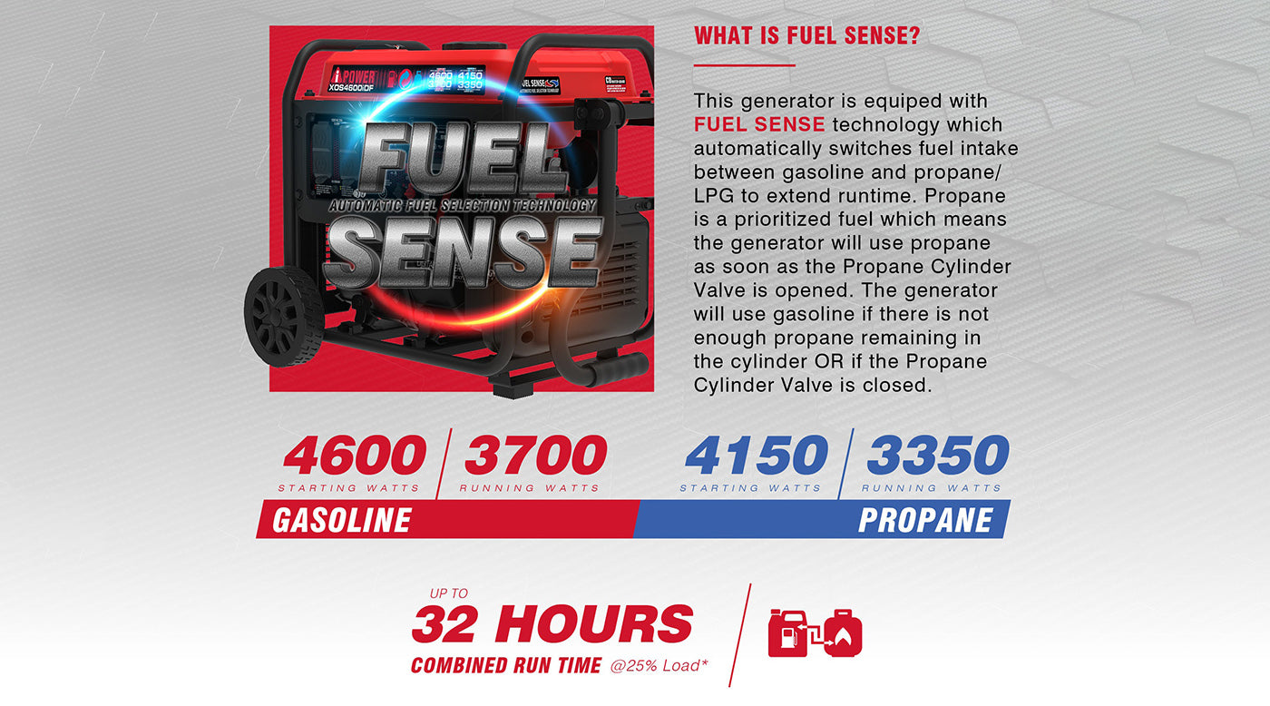 | Fuel Sense Runtime @ 25% Load (Gas + Propane) | Up to 32.0 Hours Uninterrupted |