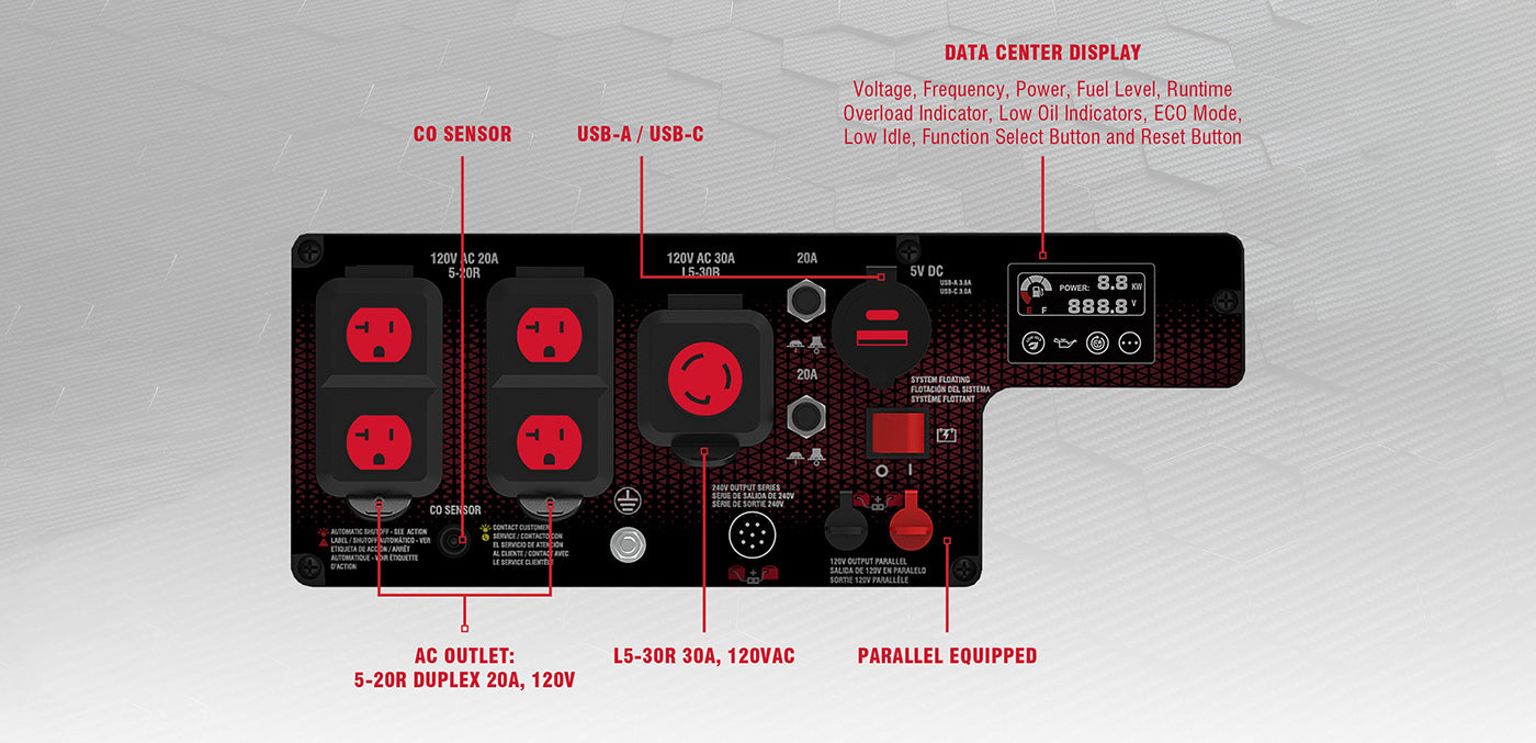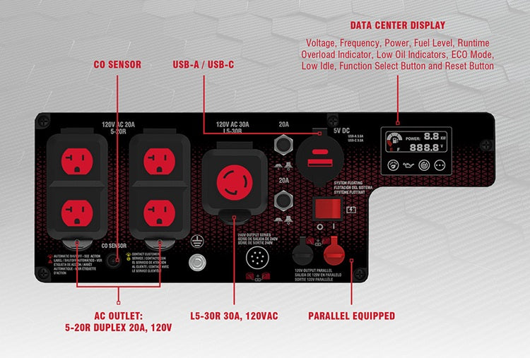 | AC Outlets | 4x5-20R (20A, 120V) - 1xL5-30R (30A, 120V) |
