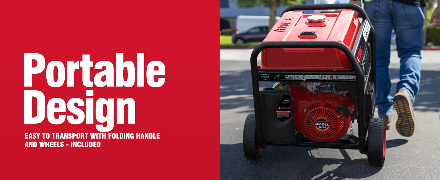 - Mobility: Hardened-steel frame with added roll bars, foam grip handle and flat-free wheels lets you easily transport this generator