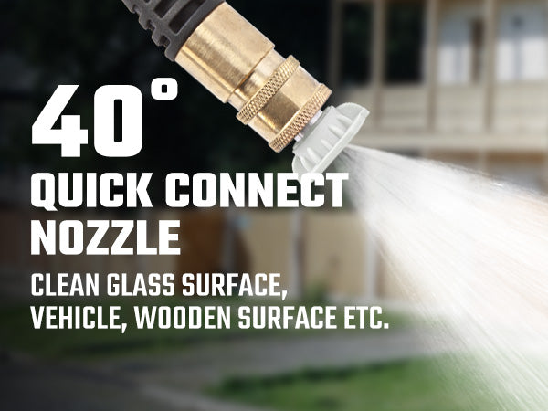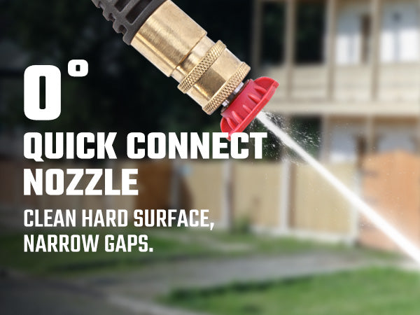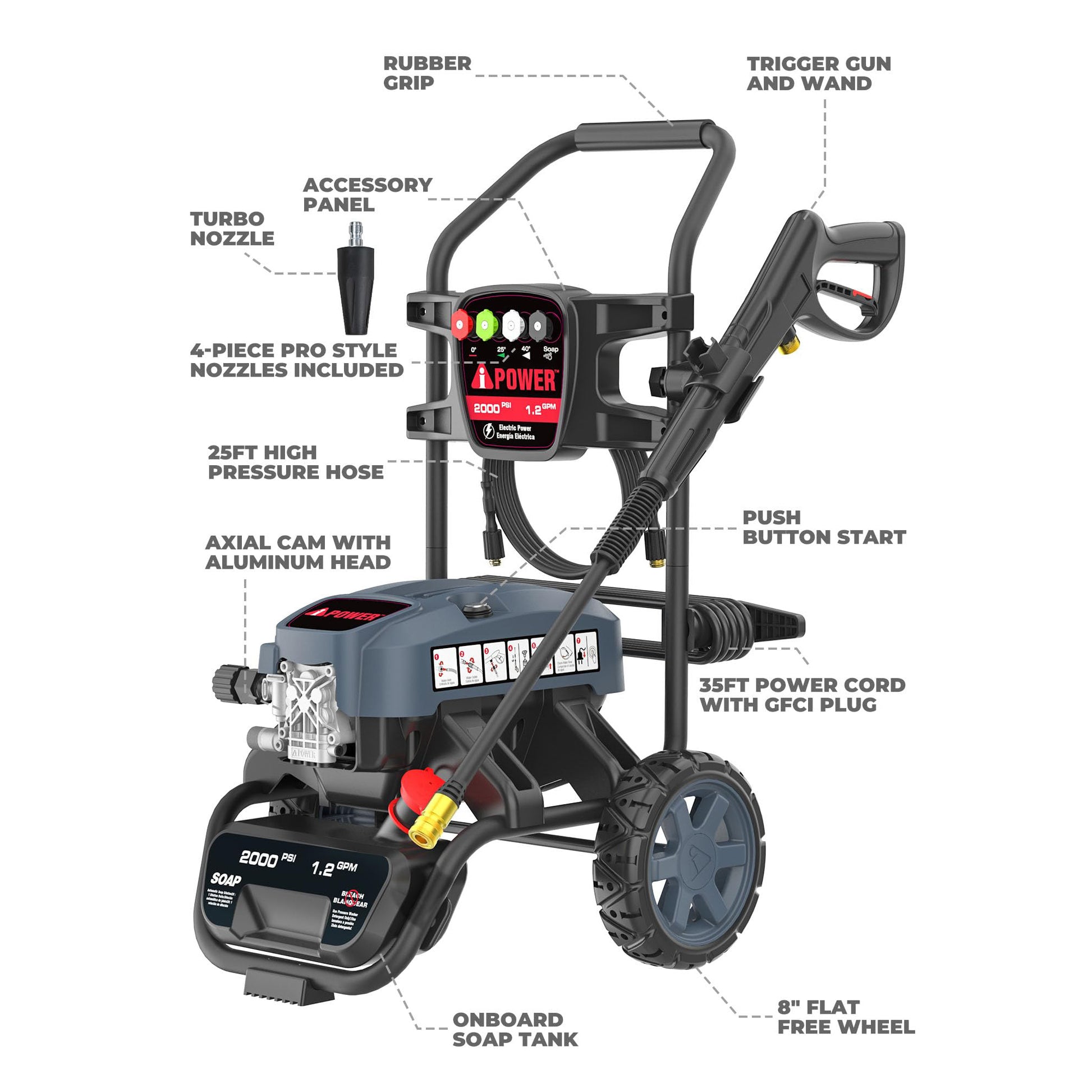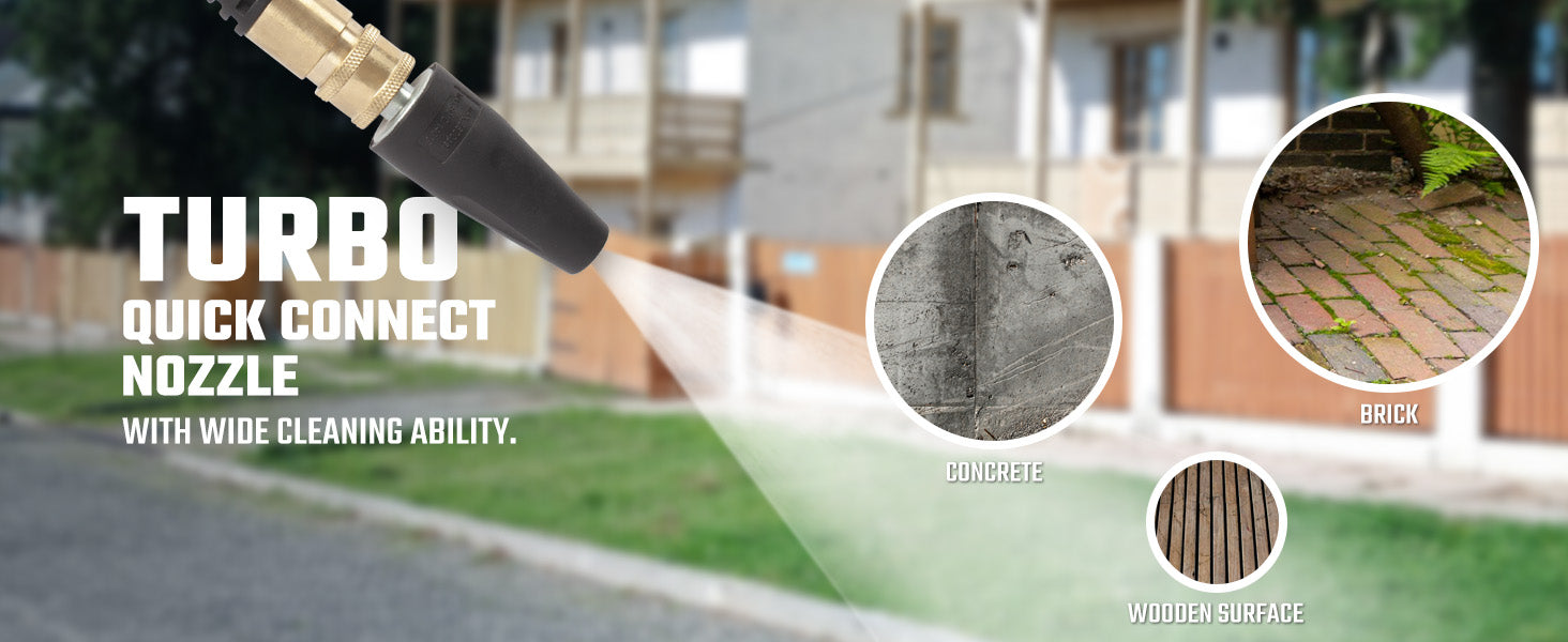 The unit features a three-piston axial pump for durable, long-term use. The extra-long 25' long co-extrude high-pressure hose provides an easy-to-move workspace. There are four pro-style nozzles, including a turbo nozzle and integrated soap tank for efficient cleaning power. The lightweight pressure washer, with 8'' never flat wheels, weighs only 28.7 pounds, allowing for convenient storage and effortless portability