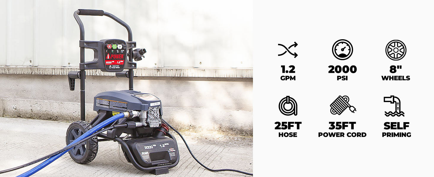 | The APW2000E PSI Electric Pressure Washer offers 2000 PSI at 1.2 gallons per minute for outstanding cleaning power. Equipped with an AC plug, the push-button starting system offers quick and convenient use, with a GFCI-protected power cord. The unit features a three-piston axial pump for durable, long-term use. The extra-long 25' long co-extrude high-pressure hose provides an easy-to-move workspace. There are four pro-style nozzles, including a turbo nozzle and integrated soap tank for efficient cleaning power. The lightweight pressure washer, with 8'' never flat wheels, weighs only 28.7 pounds, allowing for convenient storage and effortless portability | Regular price