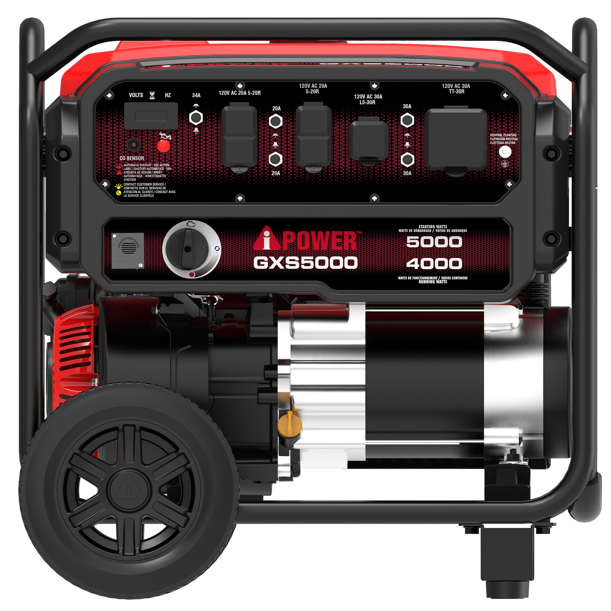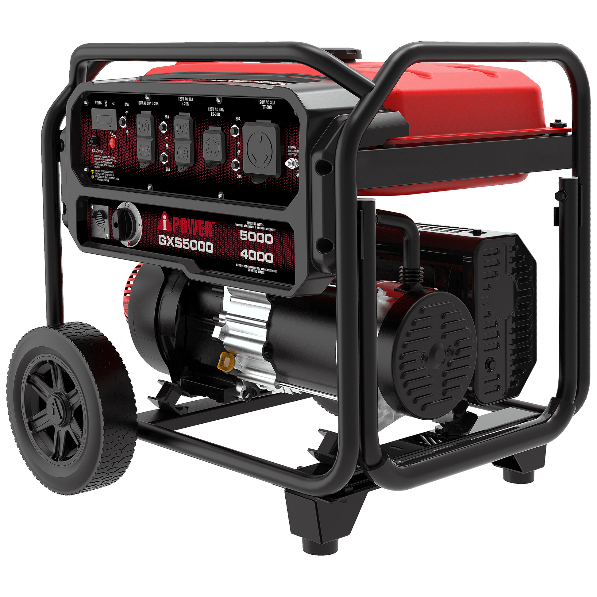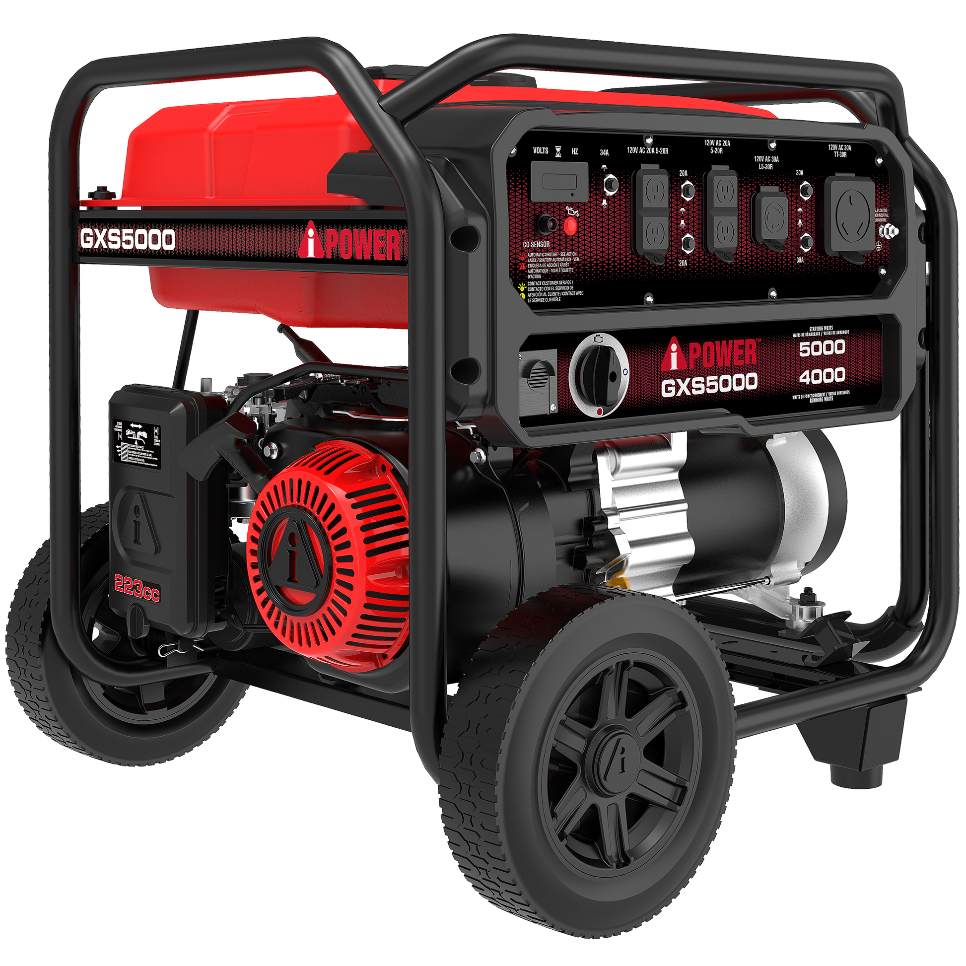 | Featuring a 223cc OHV engine with cast iron sleeve and low oil shutdown, the GXS5000 Portable Generator has 5,000 starting watts and 4,000 running watts. The 6.3-gallon fuel tank provides an extended run time of up to 20 hours at 25% load. The unit has a Digital Data Center that displays voltage, frequency, and hours, while the Rubber Outlet Covers help guard against moisture, dust, and debris. The heavy duty frame construction has a durable automotive style finish, while the portable design makes the generator easy to transport, as there is a folding handle and wheels included. The CO Sensor monitors and reacts to carbon monoxide levels, as it has automatic shutdown. | Regular price