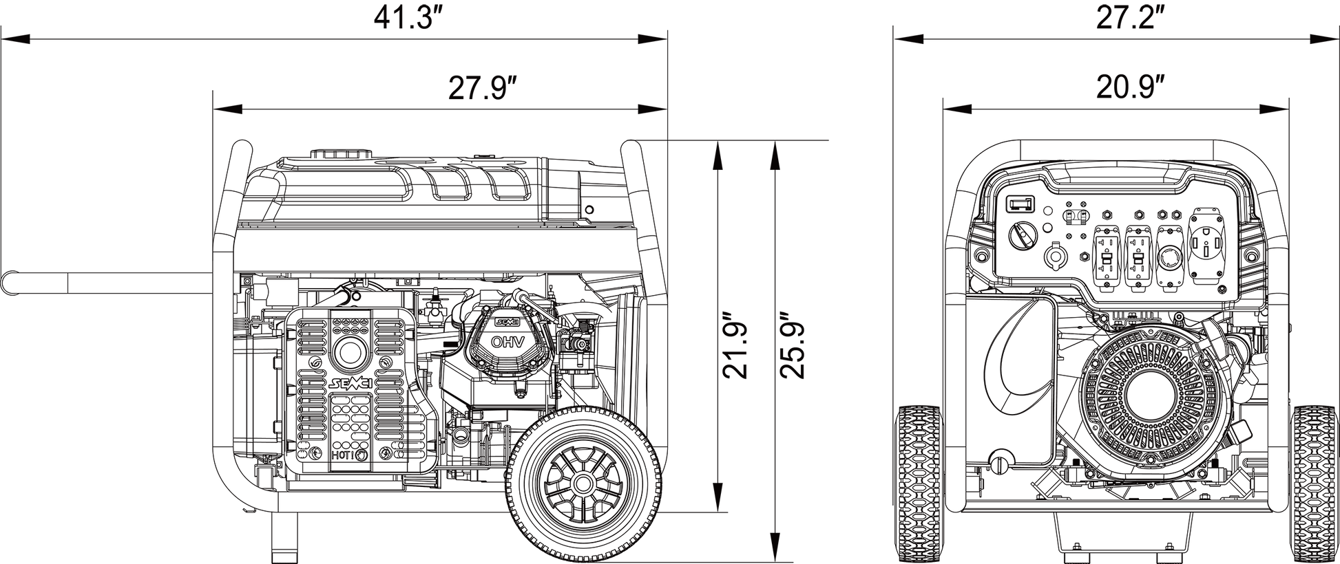 - Run Time: 6.6-gallon fuel tank for extended run time of 14 hrs. at 25% load