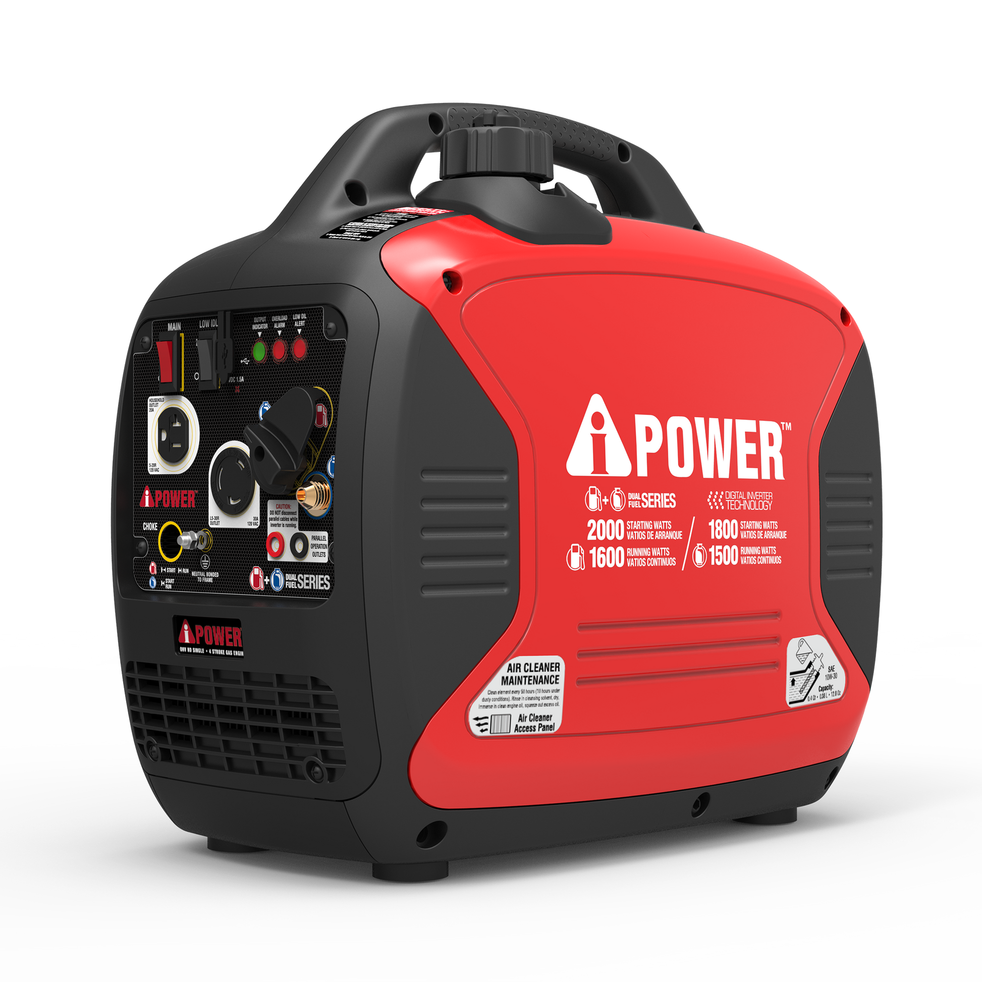 The A-iPower SUA2000iD provides 2,000 watts of starting power and 1,600 watts of running power off of gasoline - 1,800 starting watts 1,500 running watts on propane. Powered by an 80cc A-iPower engine, the generator is ideal for outdoor events such as concerts, camping trips, tailgating parties, racetracks, RVs, and many other applications. The SUA2000iD also has parallel capability. With two parallel cables, two generators can link for nearly double the power. Whatever your outdoor power needs, the SUA2000iD can offer a solution.